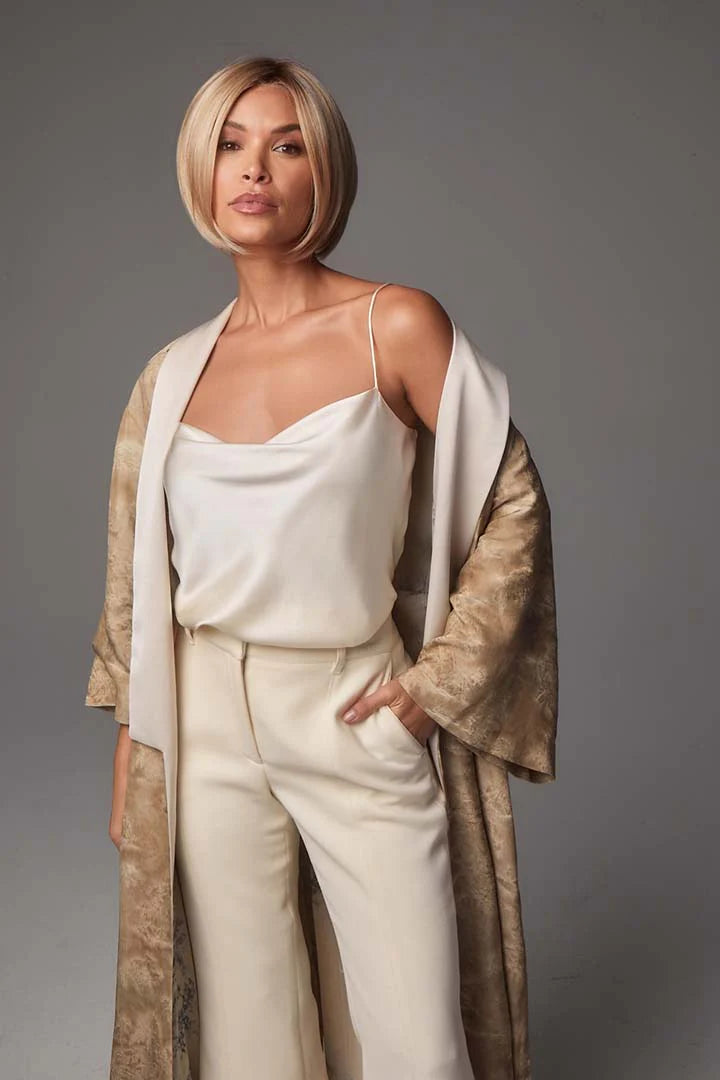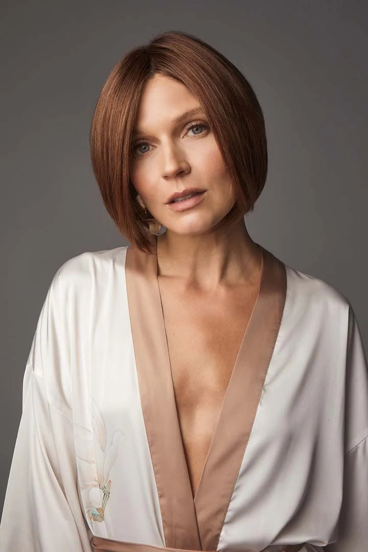 Meet Ayumi, a sophisticated short bob from the Noriko Collection that blends timeless style with modern ease. This straight, ready-to-wear cut features a clean center part and soft graduation that gently frames the neckline, creating an effortlessly elegant silhouette. Subtle, invisible layers around the face add movement and polish, while the medium density offers natural volume that’s easy to style for both everyday chic and special occasions.