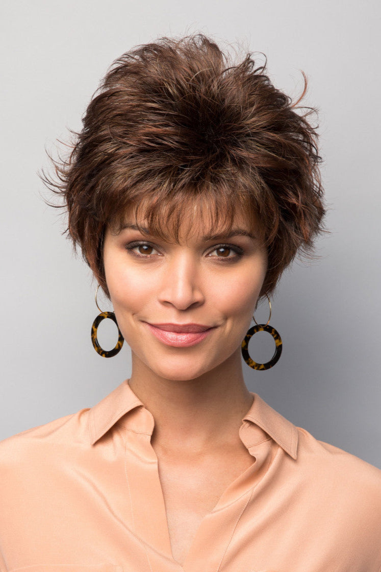 Drew by Noriko is a short textured playful cut. Featuring a open weft cap construction allowing for an airy cool design that is lightweight and ideal for everyday wear. Made with a permatease top which is a teasing, short-haired, crimping effect on the roots to create more lift and volume.