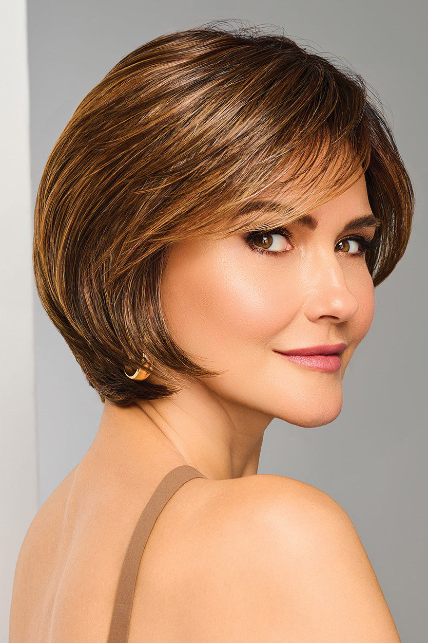 Experience instant elegance with this sophisticated bixie wig from Raquel Welch's Signature Collection. Arrive camera-ready with its pre-styled waves and contemporary wispy bangs that beautifully frame your face. The hand-tied monofilament construction delivers a remarkably natural-looking hairline while ensuring all-day wearability and comfort. Lightweight and meticulously crafted, this wig eliminates styling stress and lets you embrace effortless confidence every single day.