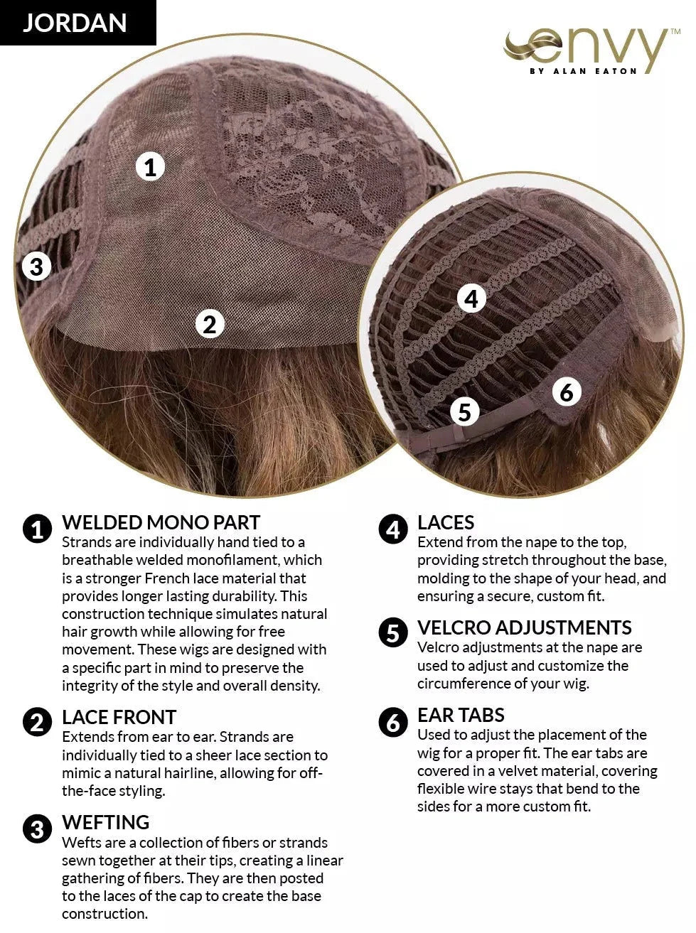 Jordan by Envy is a short wig made of a combination of human hair and heat-friendly synthetic fibers, giving you versatility in styling. The wig features a lace front and monofilament part, creating a natural appearance that mimics hair growing from your own scalp.