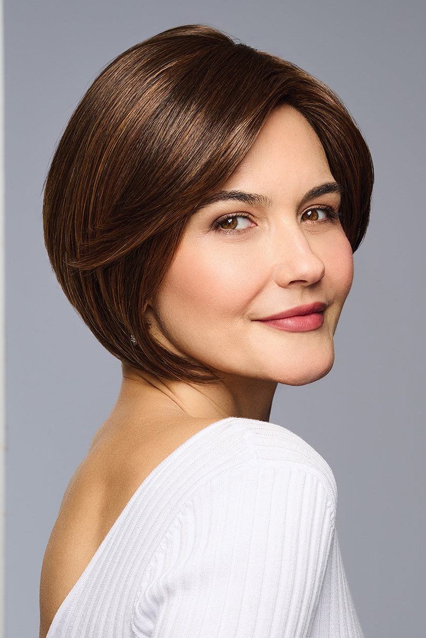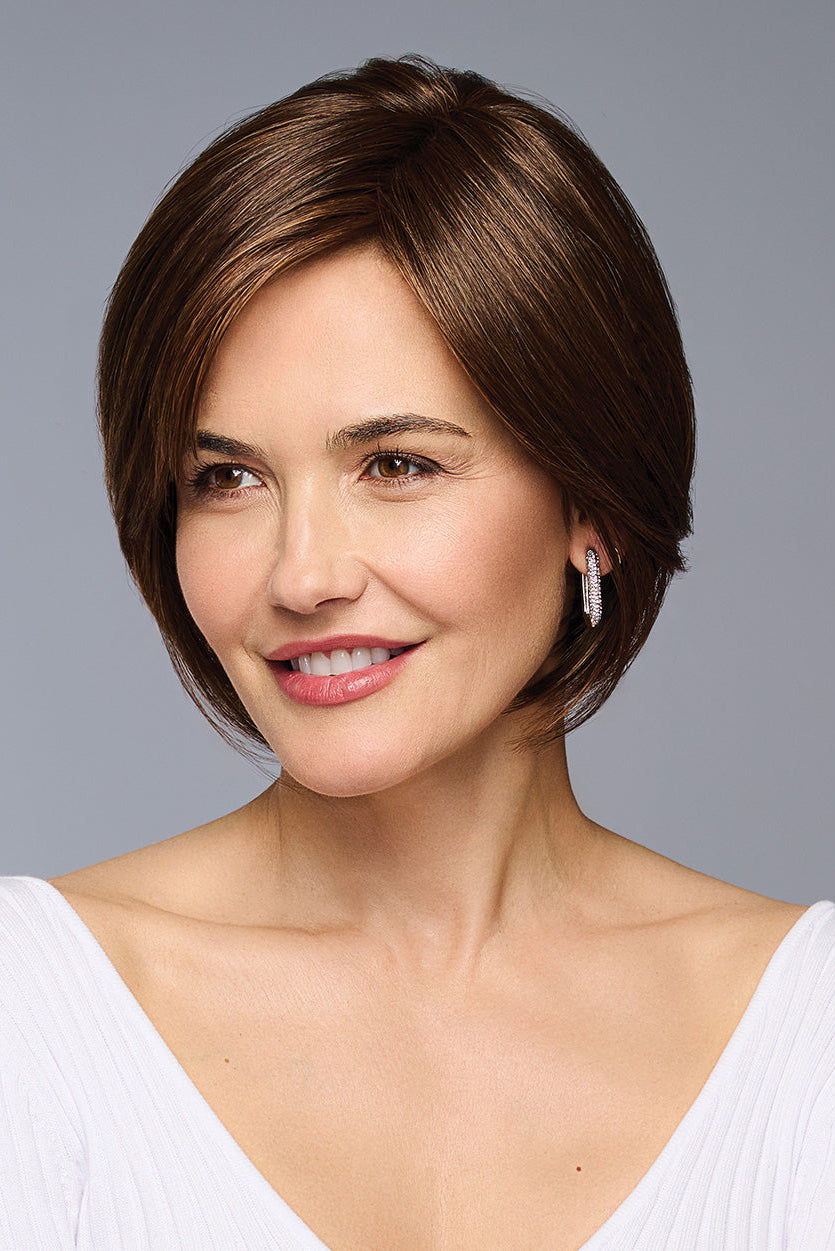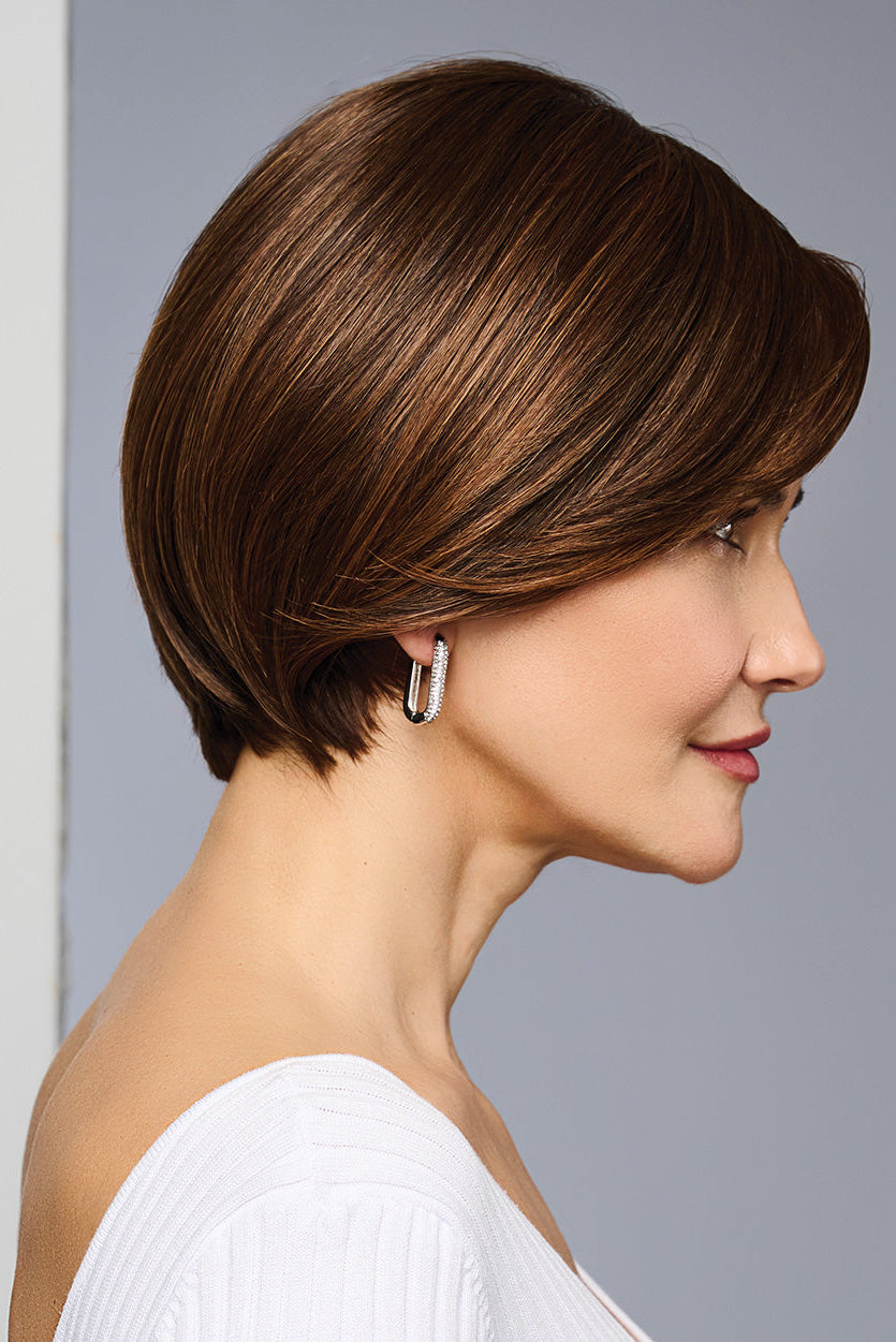 Top Billing 8” by Raquel Welch from the Transformation Collection is a compact version of the popular Top Billing topper. Its monofilament base and sheer lace front create a lifelike scalp appearance for a truly natural finish. Crafted with 8 inches of heat-friendly synthetic fiber, this short topper seamlessly integrates with chin-length hair, enhancing your look with effortless style.
